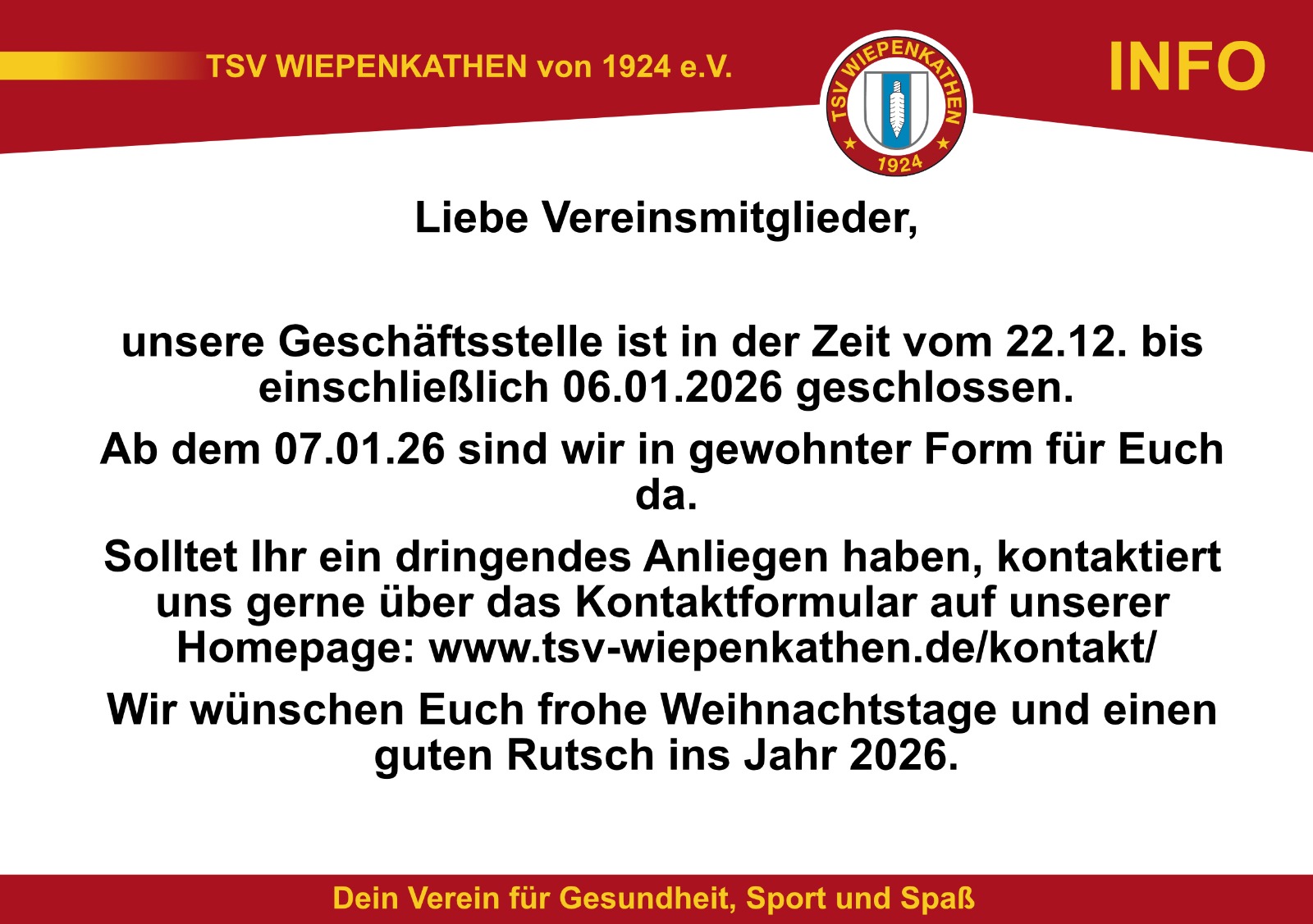 • Geschäftsstelle schließt vom 22.12.2025 bis einschließlich 06.01.2026